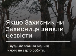 Якщо Захисник чи Захисниця зникли безвісти: куди звертатися рідним і чого не варто робити Не мати звістки від рідної людини, яка знаходиться на війні, боляче, важко й дуже тривожно. Детальніше:Якщо Захисник чи Захисниця зникли...