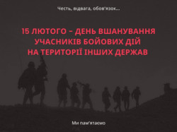 15 лютого - День вшанування учасників бойових дій на території інших держав Указом Президента України від 11 лютого 2004 року № 180 встановлено День вшанування учасників бойових дій на території інших держав. Детальніше:15 лютого - День вшанування учасників...