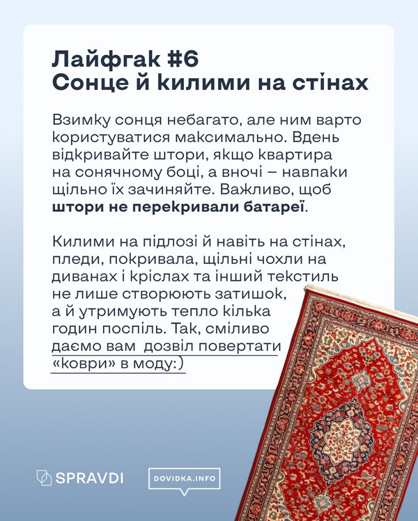 Важливу роль відіграє і домашній текстиль. Вдень відкривайте штори, щоб сонце нагрівало кімнату, а на ніч щільно їх закривайте (але не перекривайте батареї). Килими на підлозі та стінах — це не просто декор, а дієвий спосіб затримати тепло в приміщенні на кілька годин довше.