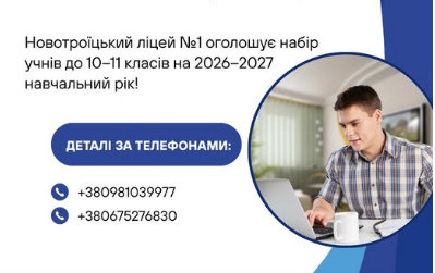 Новотроїцький ліцей №1 оголошує набір учнів до 10–11 класів на 2026–2027 навчальний рік (дистанційна форма навчання) УВАГА, УЧНІ 9–10 КЛАСІВ ТА БАТЬКИ! Якісна підготовка до НМТ та вступу у ВНЗ Сучасні онлайн-уроки та зручний формат навчання Індивідуальний підхід і підтримка вчителів Можливість навчатися з будь-якого місця Запрошуємо мотивованих учнів приєднатися до нашої освітньої спільноти! Обирайте освіту, яка підлаштовується під вас! Новотроїцький ліцей №1 – школа, де відкривають серця і можливості! Деталі за телефонами:+380981039977+380675276830 Для зарахування необхідно заповнити форму: Категорія: Оголошення та повідомлення