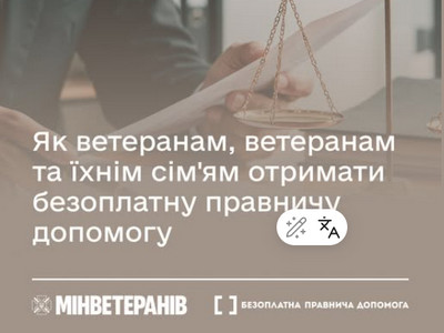 Держава гарантує ветеранам й ветеранкам війни, членам їхніх сімей безоплатну правничу підтримку. Йдеться про роз’яснення норм законів простою мовою, консультації щодо прав і соціального захисту, допомогу у складанні заяв, скарг, а також підтримку у вирішенні питань з отриманням статусів.